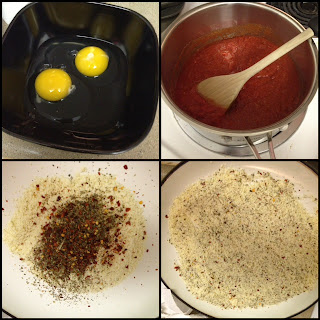 Start by heating up that marinara and leaving it to simmer while you do everything else. Add all of the spices to this sauce and let it meld together (is meld a word?!). Next grab two eggs and beat them together. Get some almond flour and mix it with spices (I used basil, oregano and red pepper flakes).
