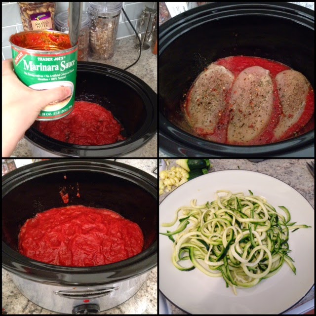 Hi all! It has been a while but I finally have a few minutes before baby girl wakes up to post. Easy crockpot meals have been my saving grace since having baby girl. I barely ever get the chance to cook and when I do I need something I can throw together in between nursing and poopy diapers. So I noticed I had some chicken a can of marinara...and some zuchinnis. I decided to just throw the chicken in the crock pot and pour over the marinara and it actually worked!